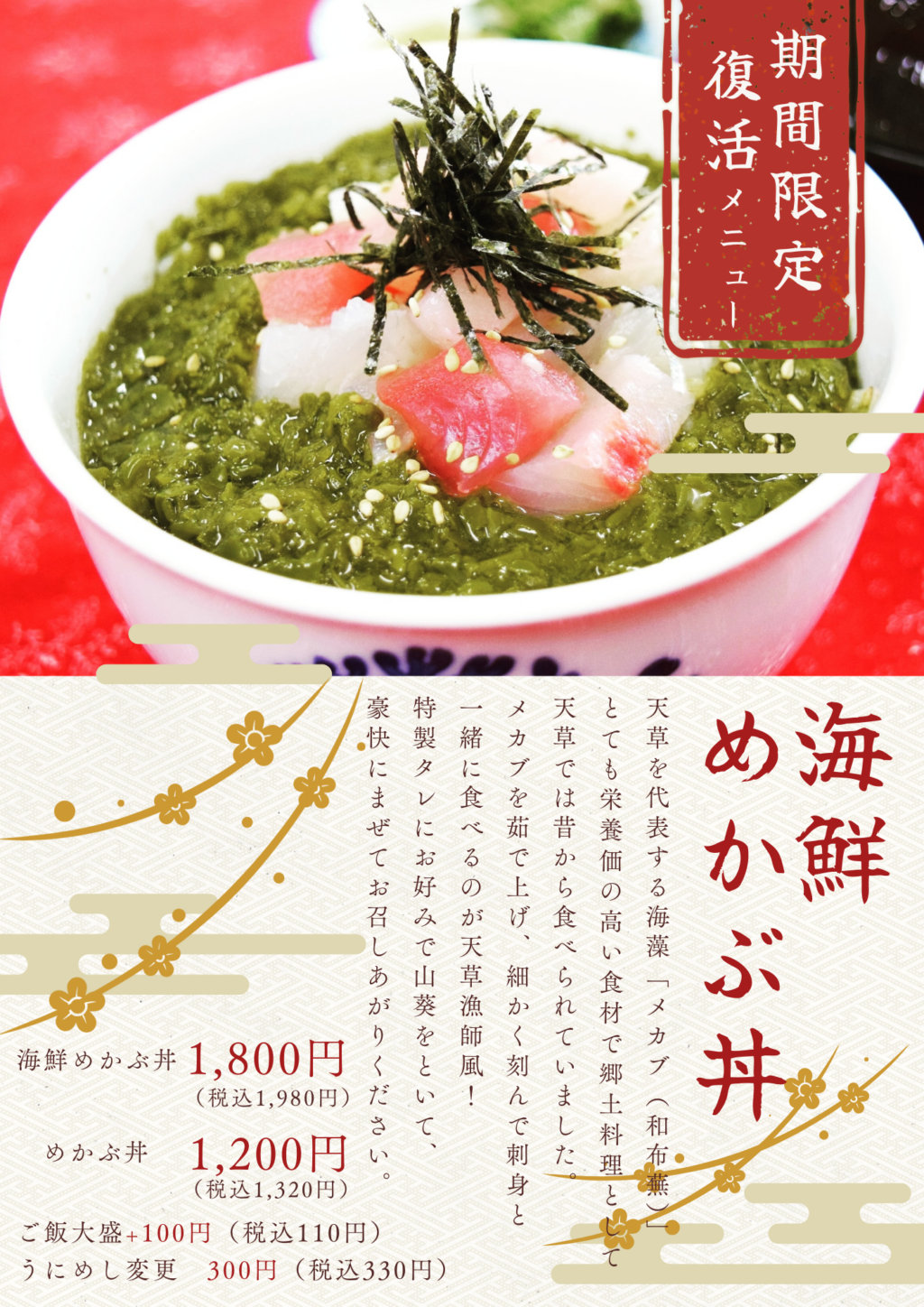 丸健インフォメーション 【期間限定】復活メニュー「海鮮めかぶ丼」 2026/01/06 1月より「海鮮めかぶ丼」が復活メニューとして登場! また食べたい!とのお声もあり、期間限定で提供いたします ご来店お待ちしております ≪ 前の記事へ記事一覧へ次の記事へ ≫