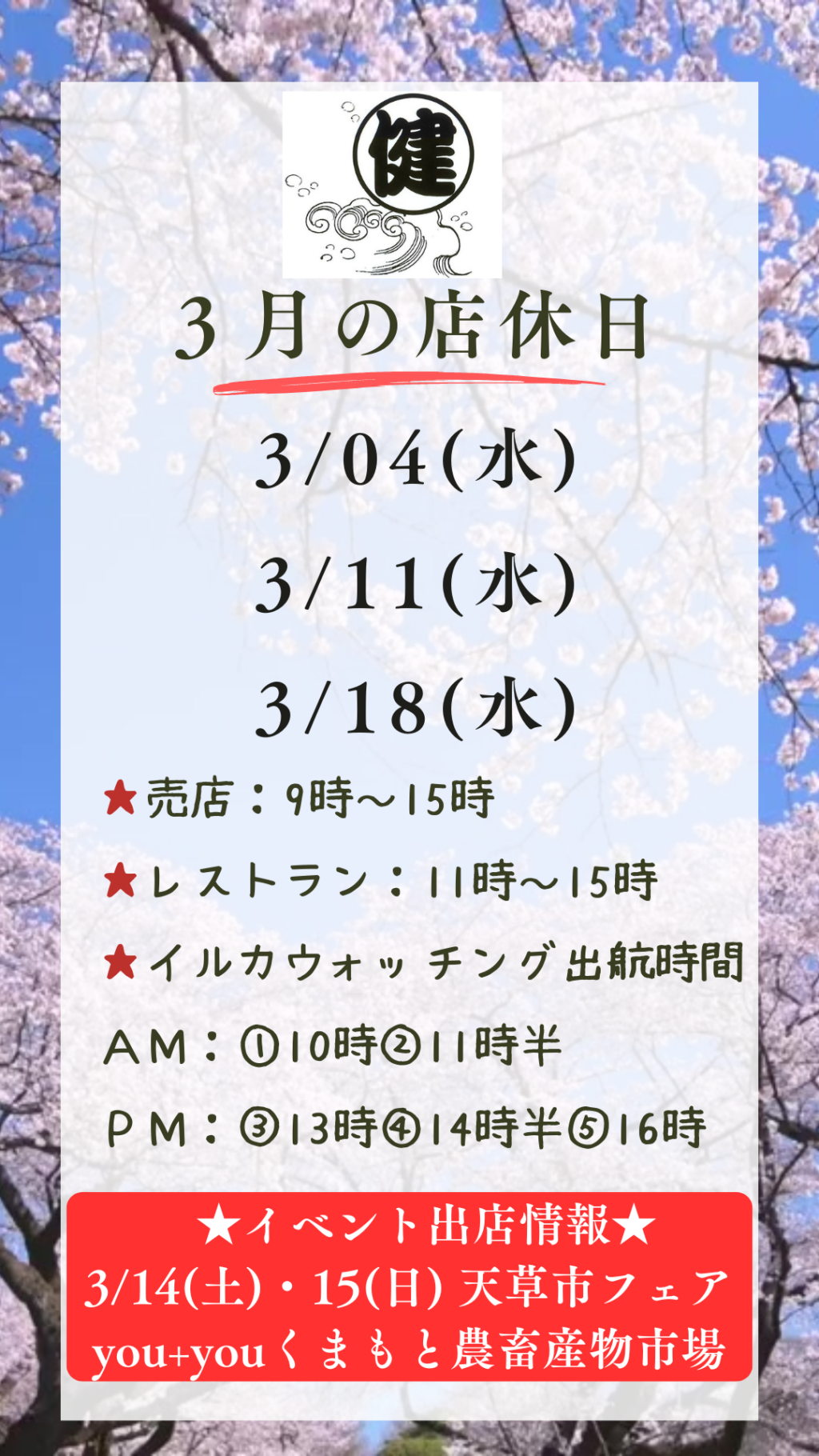丸健インフォメーション 3月店休日のお知らせ 2026/02/21 3月の店休日は4日(水)、11日(水)、18日(水)とさせていただきます。 イルカウォッチング+お食事セットは事前予約がお得になっておススメです! ≪ 前の記事へ記事一覧へ次の記事へ ≫